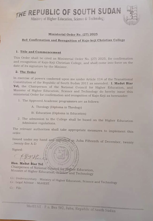 Kajo-Keji Christian College (formerly known as Canon Benaiah Poggo College) is a private institution established by The Episcopal Church of South Sudan, Diocese of Kajo-Keji in 1993.
